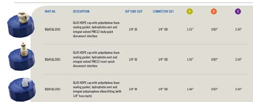 該BQ45GL系列瓶蓋的設計,以適應任何瓶用45毫米頸部開口與GL線程。這些類型的瓶,通常被稱為試劑或媒體瓶,用于與分析儀器,醫療或體外診斷(IVD)的設備。