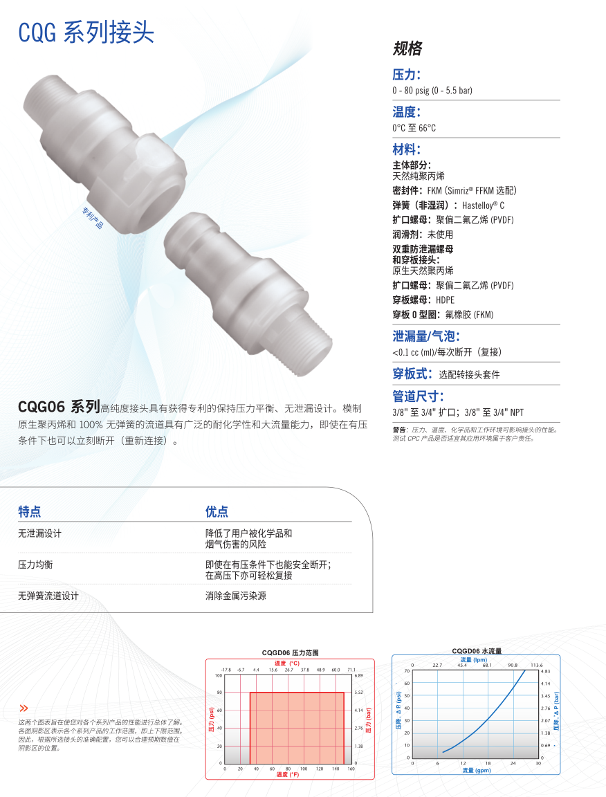 CQG Series high purity couplings feature our patented pressure-balanced, non-spill design. Molded virgin polypropylene and a 100% springless flow path provide broad chemical resistance and exceptionally high flow capacity, allowing instant disconnects (and reconnects), even under pressure.